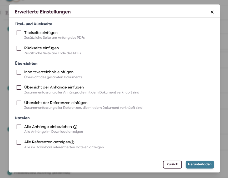 - Anhängeübersicht einfügen (unabhängig von den heruntergeladenen Dateien)
